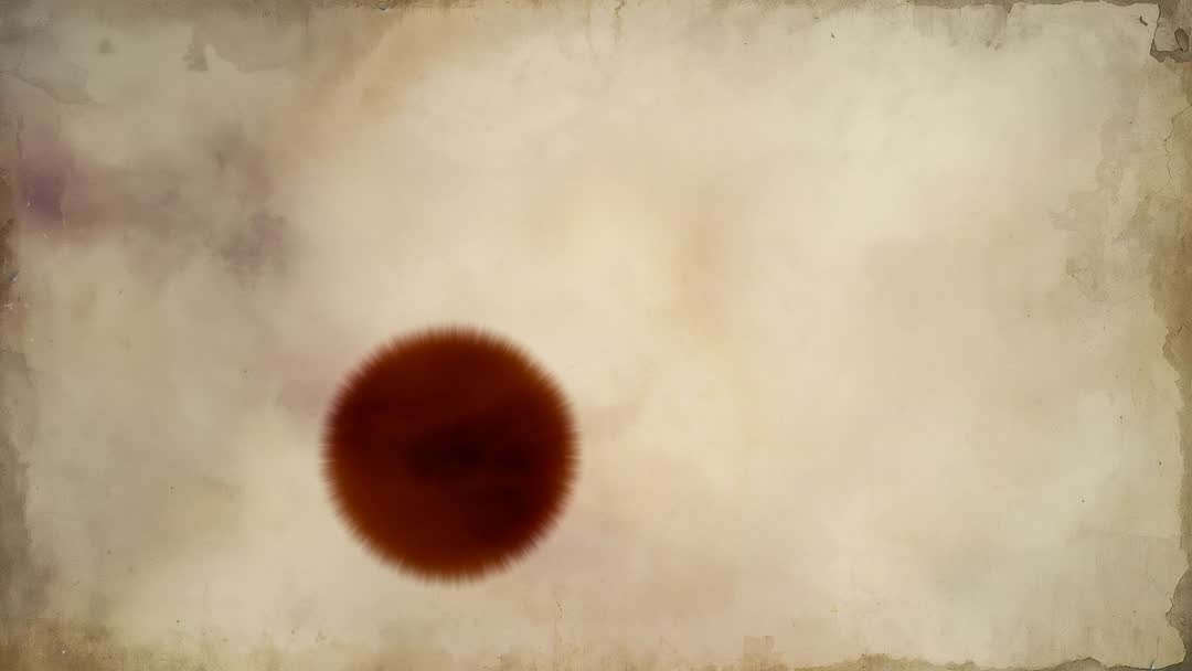 AI Generated Image. Footage showing droplet landing on aged parchment and forming fuzzy dark brown blotch while smaller droplets are spreading outward as diffuse stains. Warm sepia palette and tattered paper border creating vintage, weathered mood and strong negative space for text. Use for background in historical or craft videos, book or album title sequences, packaging mockups, stationery or invitation designs, art overlays and texture layers in photo composites. Use blending modes (multiply, overlay), slow-motion loop for demonstration of liquid absorption and diffusion, or crop for closeup detail and texture fills. Ideal for educational content about staining processes, vintage branding, editorial spreads, social media banners and creative motion graphics.