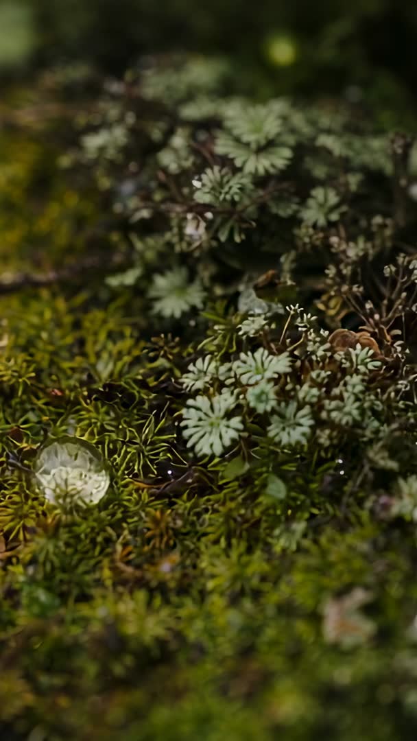 AI Generated Video. Vertical macro video showing droplet rolling across vibrant green moss toward tiny succulent rosettes. Close-up perspective highlighting texture, surface tension, delicate plant forms, gentle motion and shallow depth of field. Serving ideal uses such as nature reels, mindfulness and relaxation backgrounds, botanical product ads, environmental storytelling, horticulture tutorials, desktop and mobile wallpapers. Filming in vertical 9:16 format, ready for social media reels, stories, and vertical displays; easily looping for ambient visuals. Suggesting subtle color grading to enhance greens, applying slight slow-motion for added calm, overlaying soft ambient audio or gentle piano to evoke tranquility. Useful for eco brand promotions, spa and wellness content, guided meditation intros, and background footage for presentations focused on water, hydration, and plant care.
