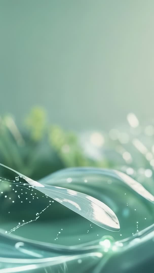 AI Generated Image. Showing delicate droplet rolling across transparent membrane and trailing glowing green particles over soft teal background. Emphasizing fluid surface tension, curved membrane contours, and sparkling particle spray from macro perspective. Optimizing vertical format for mobile and social platforms, creating loop-friendly motion for repeating playback. Serving science, technology, skincare and beauty advertising, wellness branding, environmental and nature visuals, motion design overlays, app intros and product reveal sequences. Delivering calming, fresh, clinical color palette for modern layouts. Providing generous negative space at top for headline or text overlays and easy integration into templates. Offering slow-motion feel with cinematic bokeh and crisp highlights for premium editorial and commercial use.