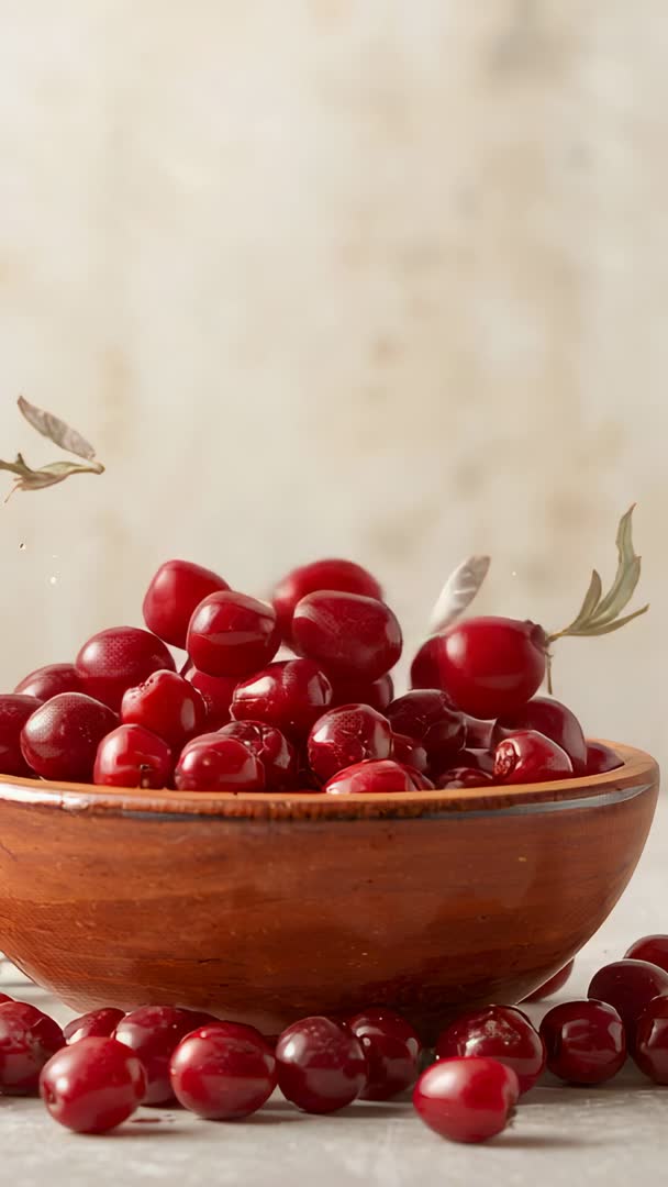 - Dropping Red Cherries Into Clay Bowl, Scattering Across Tabletop, Vertical Food Video