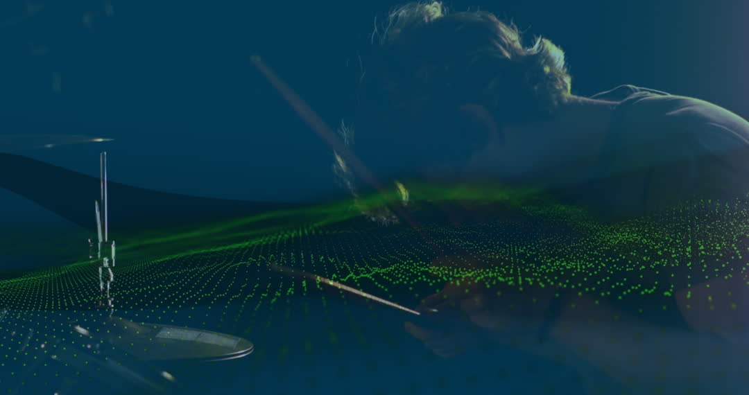 Caucasian drummer playing energetically while digital green landscape animates as backdrop. Captures live music performance infused with technological art. Ideal for illustrating creativity in multimedia projects, blog posts on music technology fusion, or promotional materials for music events.