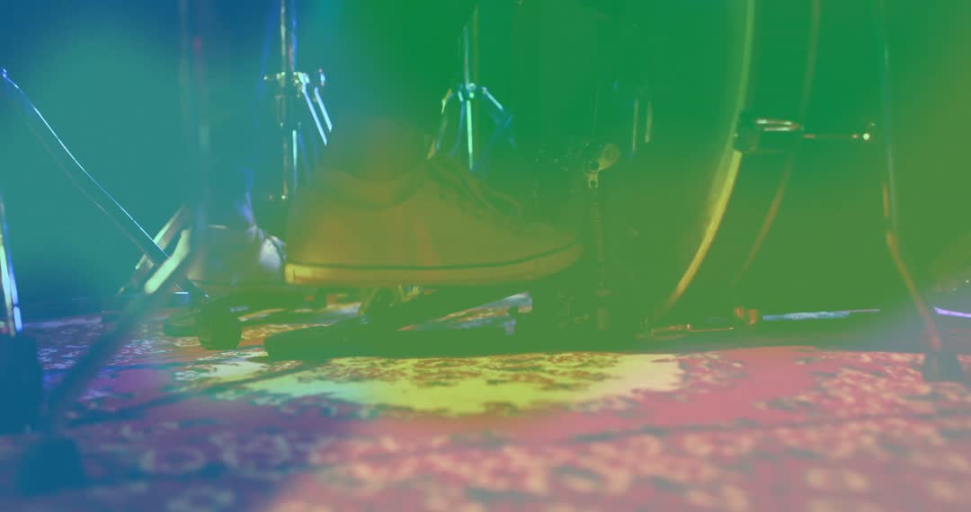 Dynamic portrayal of a drummer's foot on pedal under vivid, colorful lights. Ideal for materials focusing on music, concerts, or instrumentation. Suitable for use in articles or promotions related to drumming techniques, live performances, or music festival contexts.