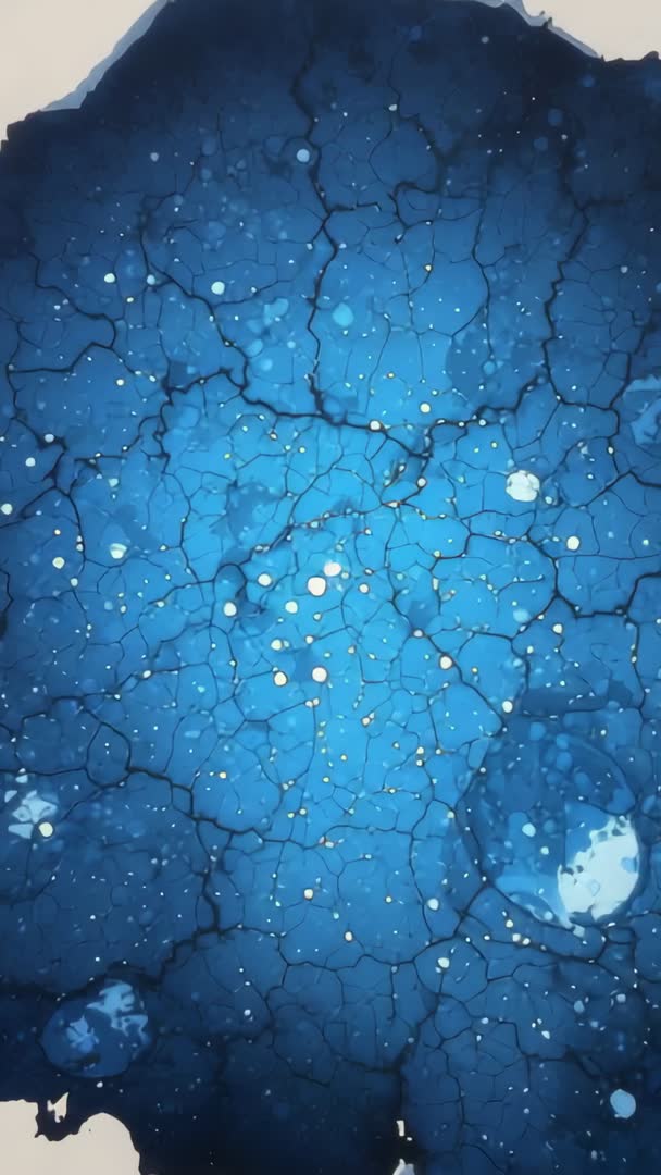 AI Generated Image. Showing drying cobalt-blue ink spreading across paper, forming intricate crackled veins and scattered white speckles. Center area brightening as pigments pull toward edges, creating depth and subtle gradients. Vertical 9:16 framing capturing macro details and natural micro-texture, optimized for mobile-first content. Providing abstract organic visuals for loopable background, social media reel, app intro, music visualizer, product campaign, packaging mockup, editorial art, or science-inspired infographic. Compatible with slow-motion edits and color grading to match brand palettes. High-contrast blue tones working well for ocean, technology, creativity, or wellness themes.