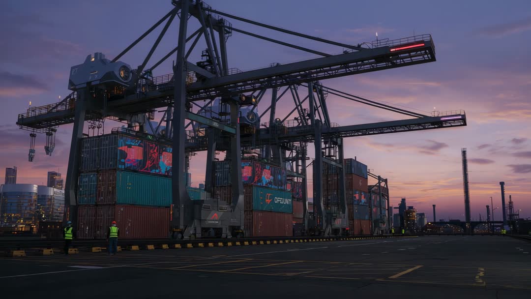 AI Generated Image. Short video clip showing dusk port operations with gantry cranes loading stacked containers on illuminated quay terminal. Cinematic twilight light with purple-orange sky creating moody industrial atmosphere while workers in hi-vis vests walking along perimeter, adding human scale and safety context. High-detail on heavy machinery, container stacks, and illuminated gantry booms conveying modern logistics and night operations. Suitable for use in corporate logistics presentations, transport and supply chain marketing, port authority promotional content, industrial safety training, urban development and infrastructure documentaries. Edit-friendly composition offering wide negative space for lower third titles and on-screen graphics, color grading adaptable for cinematic or commercial looks. Ideal for broadcast, web hero banners, social media ads, and editorial features covering shipping, freight, and trade.