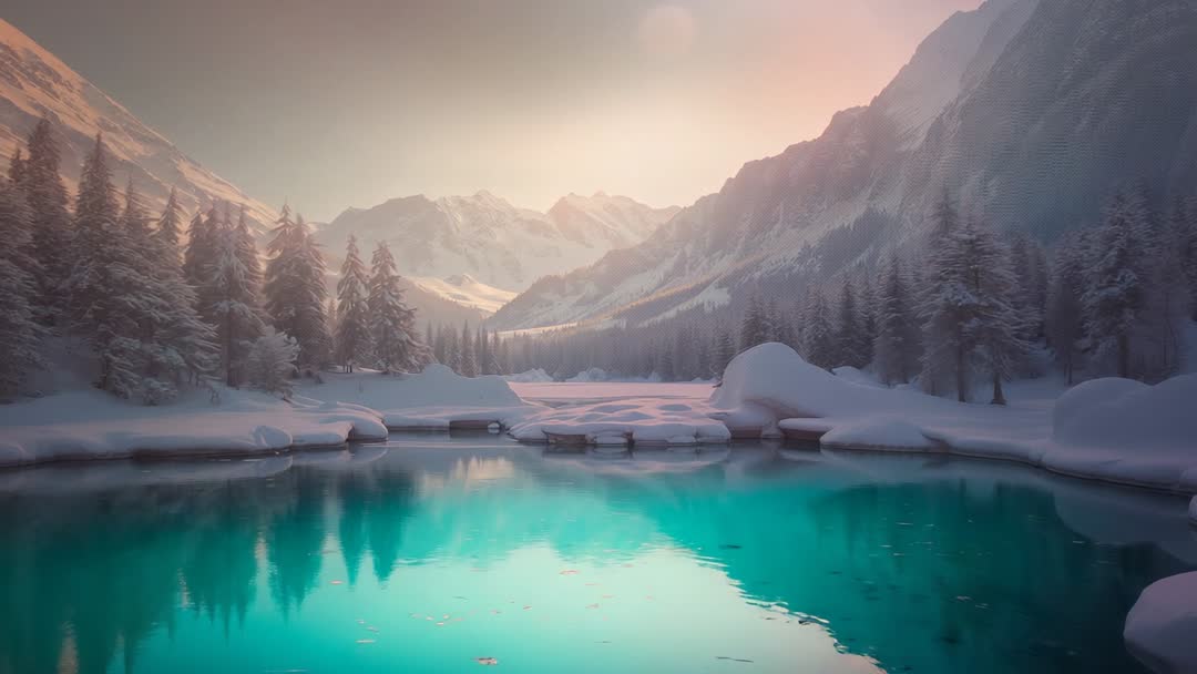 AI Generated Image. Video offers a breathtaking view of an emerald lake mirrored by snow-capped mountains and surrounded by pine trees. The shifting sunlight at dusk produces a tranquil and breathtaking ambiance. This AI-generated footage is ideal for relaxation to highlight the peaceful and serene beauty of mountainous landscapes, perfect for travel blogs, eco-living content, or meditation videos.