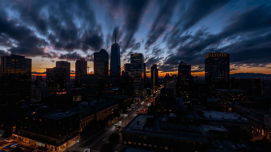 AI Generated Video. Clip showing downtown skyline transitioning from sunset to night, central spire dimming into silhouette against dramatic cloud streaks while cars are leaving glowing light trails along main avenue. Visual tone conveying urban energy, evening commute, and cinematic atmosphere. Ideal for corporate videos, travel promos, website hero backgrounds, social media ads, broadcast openers, news segments about city life or transportation, real estate and architecture showcases. Useful for opening sequences, title plates, lower thirds, or loopable background for digital displays. Recommending mild color grading to boost contrast and warmth, cropping to 16:9 or vertical 9:16 for social formats, and subtle speed ramping to emphasize motion.