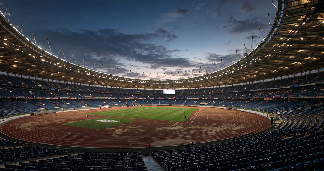 - Dusk View of Illuminated Athletics Stadium Awaiting Event