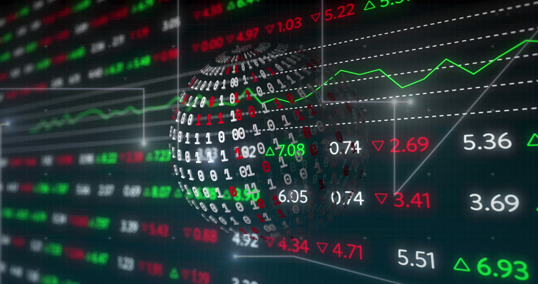 Futuristic display showing a 3D sphere with binary code amidst fluctuating charts and graphs. Perfect for illustrating concepts related to finance, global markets, technology, data analysis, or digital transformations. Suitable for use in presentations, publications or promotional materials highlighting innovation or tech industry themes.