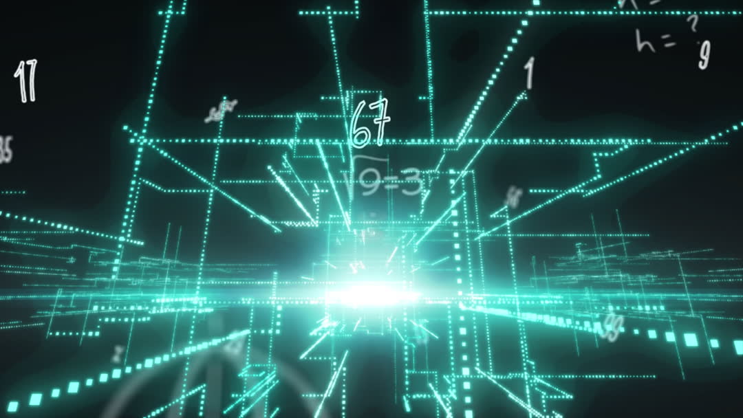 Energetic visual representation showing interconnected 3D grid with numerical data and equations floating, symbolizing technologies in digital communication and data analysis. Ideal for use in technology company presentations, educational media demonstrating math or data processing concepts, and promotional content for digital innovation solutions.