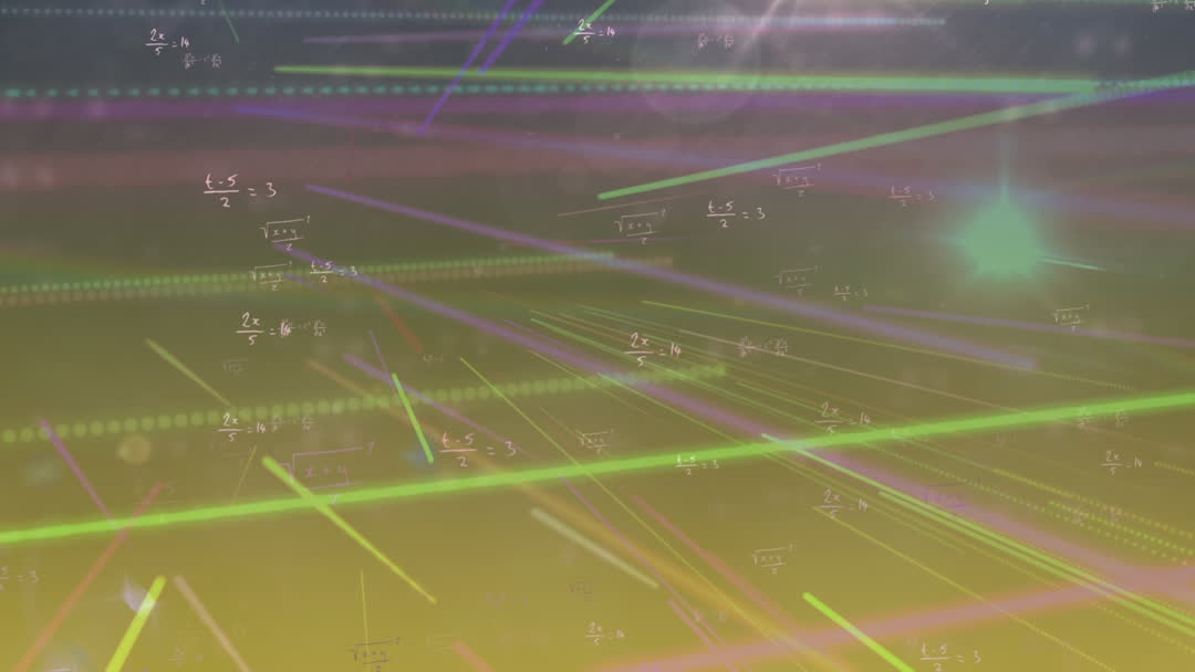 This abstract animation features mathematical equations overlaying vibrant light streaks, creating an engaging digital environment. Ideal for educational content to visualize math AND activities coupled with technological advancements. Used effectively in presentations for futuristic or technology-related fields, simultaneously for advertisements exploring global business solutions.