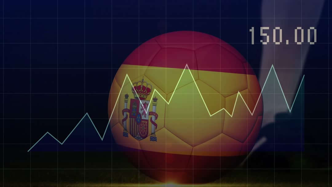 The video frame showcases a soccer ball featuring the Spanish flag overlaid with a fluctuating performance graph. A cleat approaches, suggesting a dynamic action scene representative of sports analytics. Ideal for use in presentations on sports performance analysis, articles discussing trends in soccer analytics, or educational materials on sports data visualization concepts.