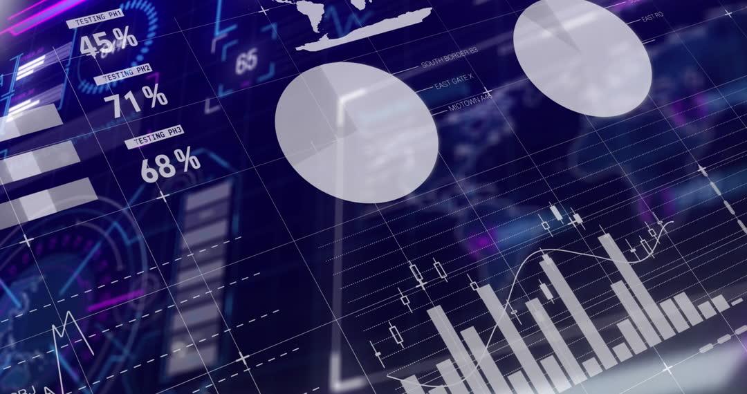 Animated scene depicts advanced data processing and visualization. Featuring digital charts and graphs, perfect for representing technology or business concepts in presentations or videos, illustrating data analysis processes, or enhancing interactive reports.