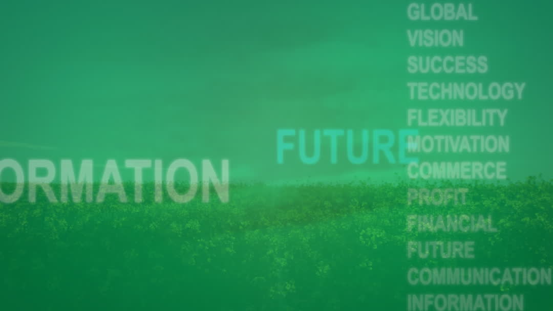 This animated scene showcases prominent business-related terms dynamically moving across a vibrant green backdrop of a field of rapeseed. Words like 'global', 'technology', 'future', and 'success' prefacing over the scenic landscape evoke forward-thinking and progress. This visual blend of nature and business keywords conveys a narrative about sustainable development and innovation. The animation suits business presentations about strategic planning, future innovations or success strategies, as well as digital marketing campaigns highlighting the intersection of technology and environment.