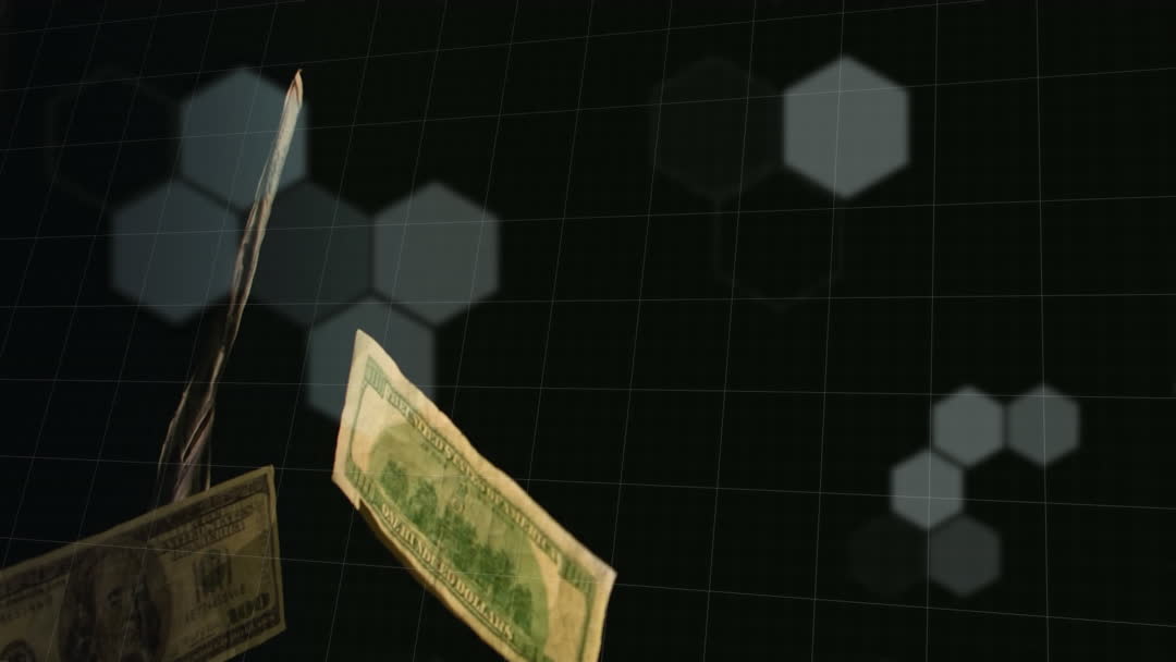 This visual portrays a dynamic representation of currency, including dollar bills, amidst animated technological data. The interconnected, hexagonal shapes signify digital networks and global business. This video can be used for business and finance websites, presentations on data analytics, or educational materials on economics and digital transactions. Perfect for backgrounds or introductory slides in tech-related financial themes.