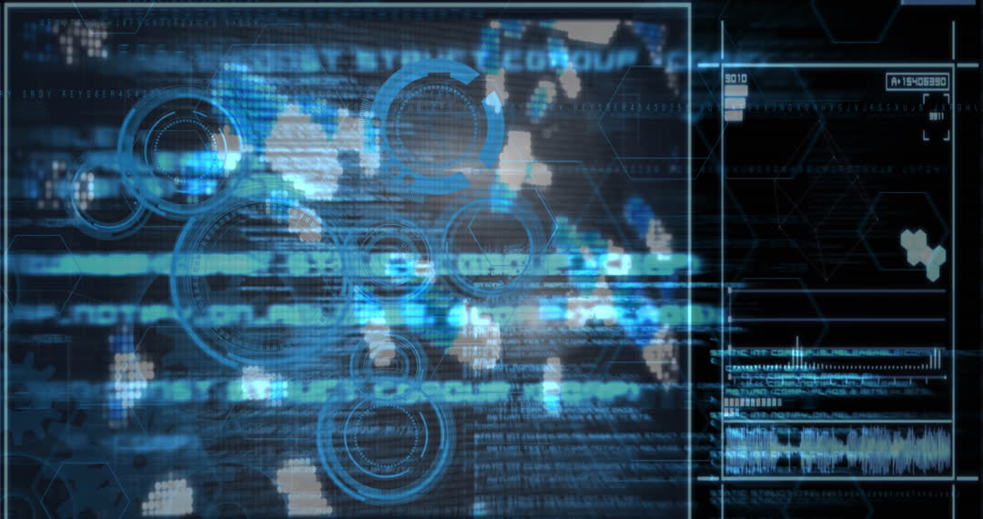 Animation illustrates a complex network data processing interface featuring various digital graphics in blue tones. It evokes themes of futurism and cyber security. Ideal for use in technology presentations, cyber security discussions, or visual effects in tech-related videos.