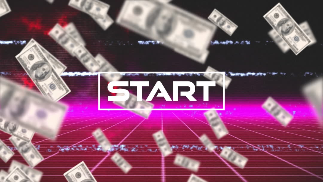 Animation captures long bills appearing to fly towards viewer, set against vibrant retro aesthetics with pink grid and red clouds. Emphasizing concept of wealth or financial growth, applicable for video intros about finance or gaming-related content. Use for digital media projects seeking dynamic visuals linked to money and futuristic themes.