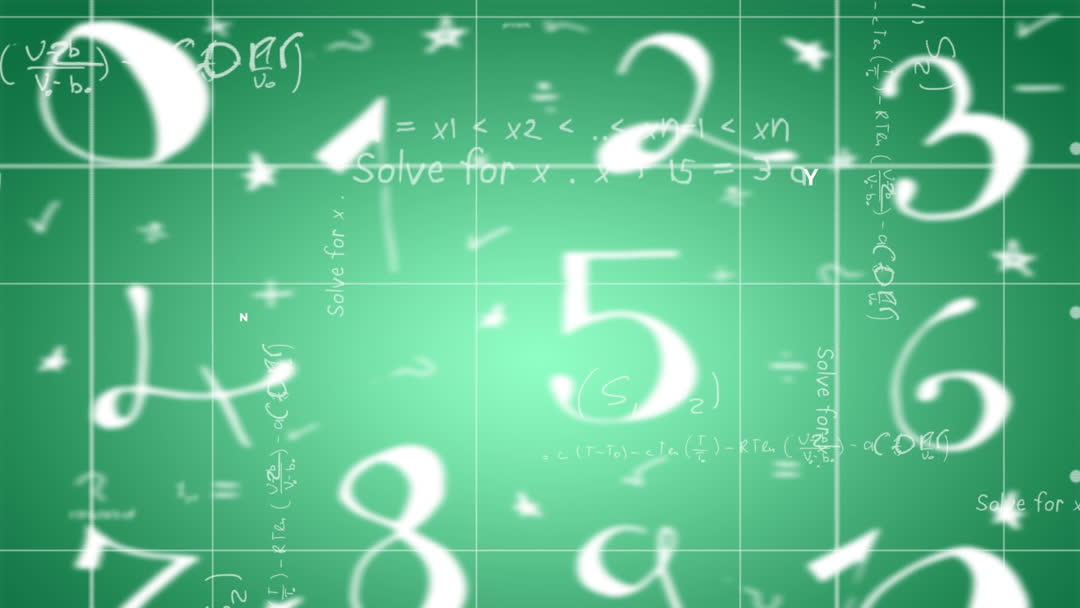 Dynamic animation displays transforming numbers and mathematical equations against a green background. This visualizes data processing concepts for use in educational, scientific, or technological presentations. Effective for illustrating themes in mathematics education and digital technology advancements.