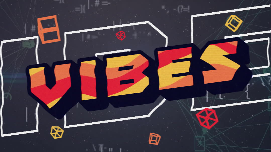 Graphic featuring 'Vibes' boldly displayed over a background of glitchy patterns and digital connections. Use for themes of modern communication, technology trends, and digital connectivity campaigns or promotional material.
