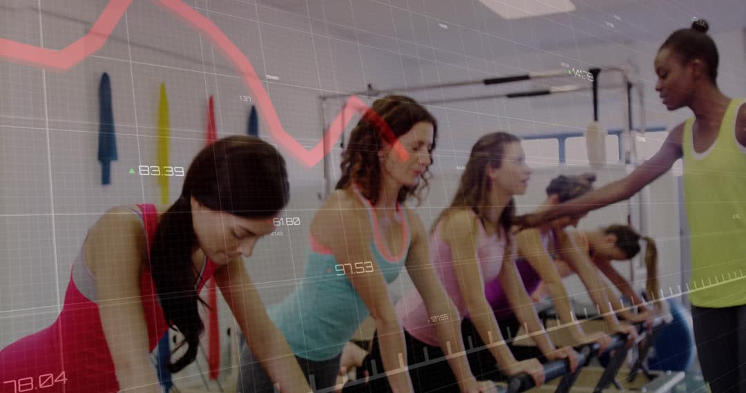 Women participating in a barre fitness class are guided by an instructor. The overlay of gridlines and a red graph represents performance analytics and fitness tracking. This video can be used in advertisements for gyms, personal training services, fitness programs, or wellness retreats showcasing modern training techniques.