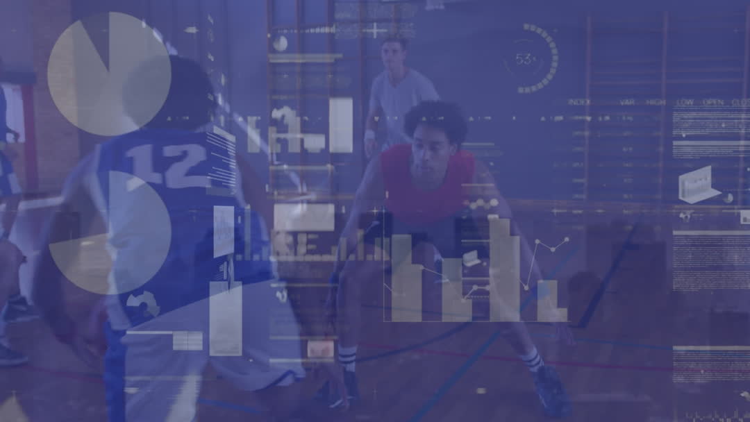 The visual showcases intense basketball gameplay intertwined with various data visualizations in a futuristic digital interface. The statistics and graphic overlays suggest concepts of sports analytics and tech innovation. It is ideal for use in contexts related to sports technology, game strategy analysis, and data processing in athletics. The visual appeals to audiences interested in the integration of sports and modern technology.