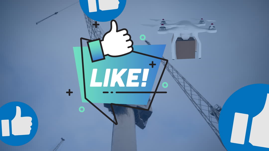 Vibrant graphics merge a like symbol and social media elements, overlaying a drone and crane scene. Ideal for depicting the convergence of technology with online retail solutions, digital marketing, and modern delivery services.