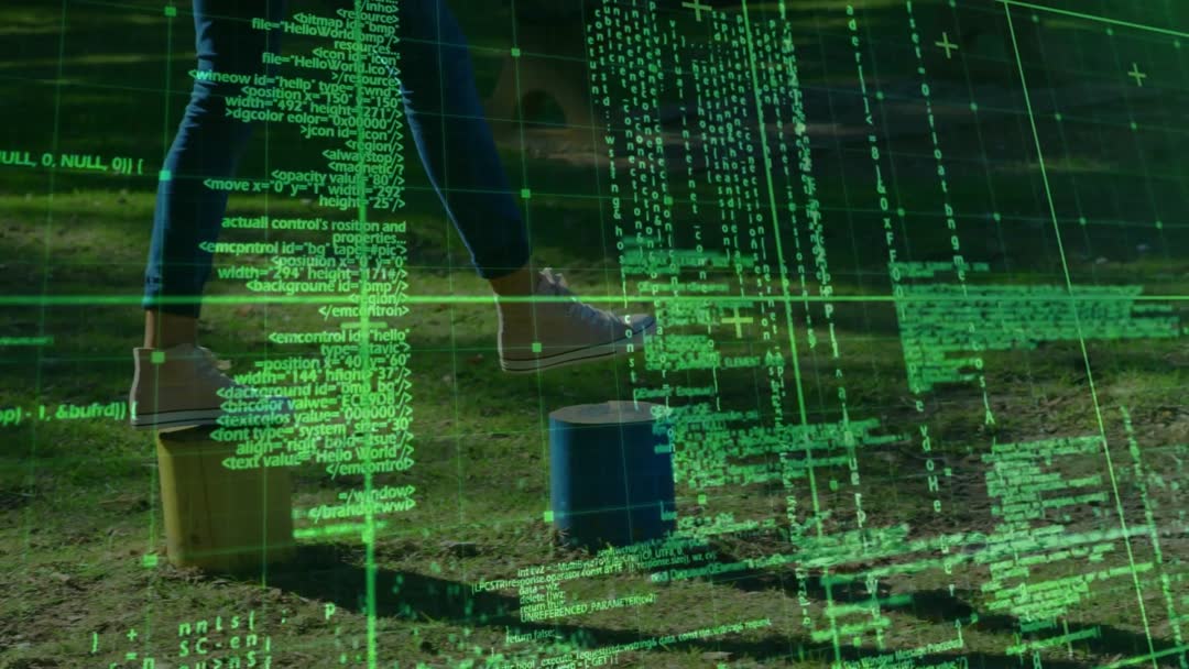 Scene shows technology in motion with an individual hopping between blocks outdoors. The digital code overlay provides a futuristic element, highlighting a blend of exercise and technological tracking. This can be used for topics related to movement analysis, future technology in fitness, or agility training systems.