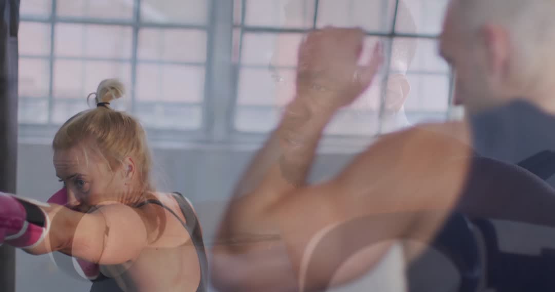 Image captures intersecting action blends featuring two individuals practicing boxing moves in a modern gym environment with large windows providing natural light. This animated effect emphasizes the dynamism and intensity of the workout, perfect for promoting fitness and sports-focused content. Useful for advertising athletic training sessions, gym memberships, or illustrating editorial articles on martial arts techniques and health benefits.