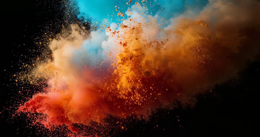 AI Generated Image. This video captures a dynamic and vibrant explosion of colorful powders, showcasing an animated blend of orange, red, and teal hues against a black background. The contrasting colors create a sense of energetic motion and excitement, making it ideal for use in creative projects, advertisements, or presentations related to art, fashion, or innovation. The dramatic visual impact of the colored particles can also enhance artistic themes or marketing material emphasizing energy and creativity.