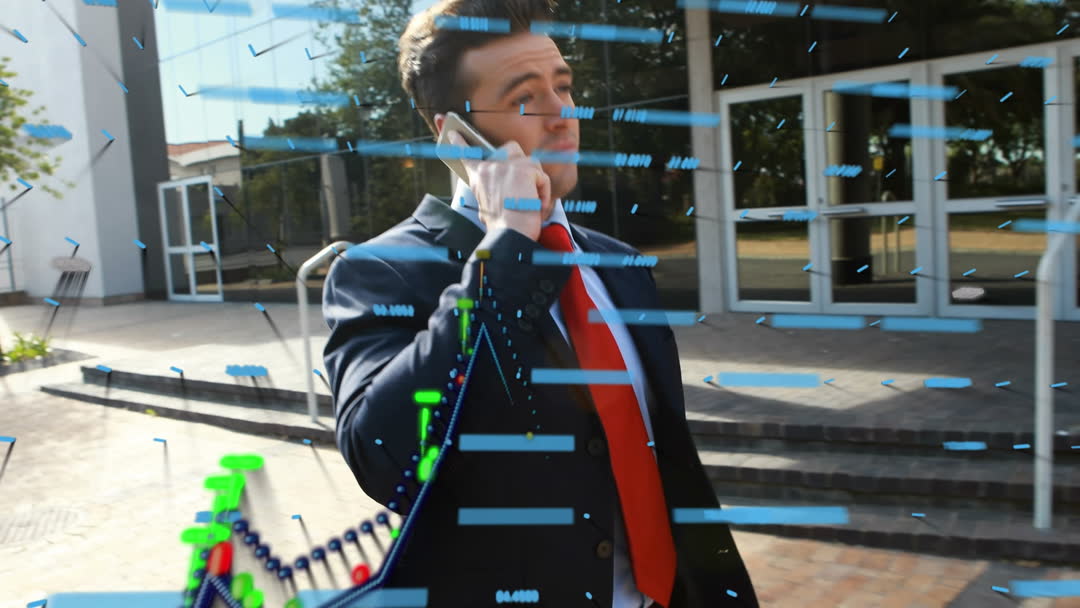 Businessman talking on a smartphone with dynamic graphs overlay signifies modern financial communication and technology integration. Suitable for illustrating themes related to business strategies, technology in finance, communication advancements, and digital economy development.