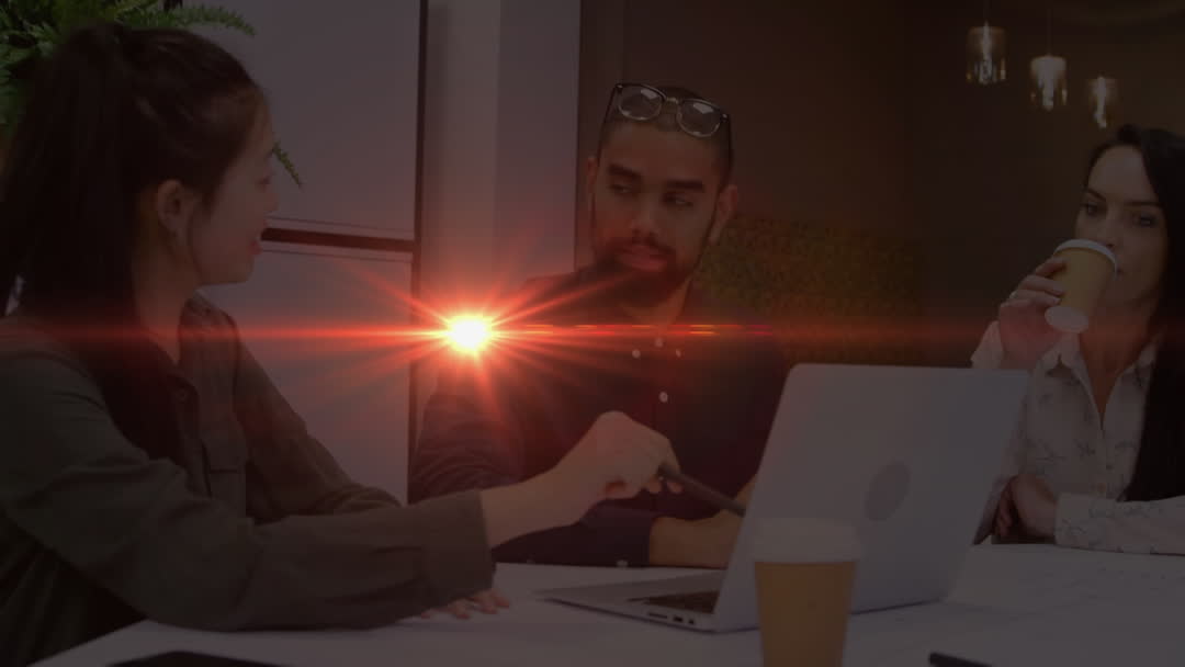 Team members collaborating in an office with a moving holographic light, symbolizing innovative technology in a modern workplace. Useful for illustrating concepts of teamwork, futuristic business solutions, and contemporary workplace environments in marketing materials and presentations.