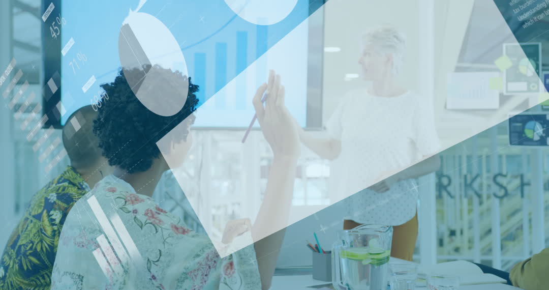 Business team engaging in meeting with data visualizations overlay. Useful for illustrating modern business strategies, technological integration, or corporate collaboration themes in presentations and marketing materials. Perfect for content that emphasizes the importance of data-driven decision making in business.