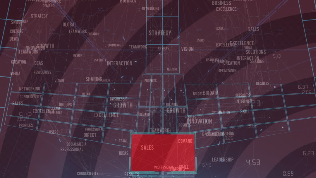 Illustration of a business-oriented digital schema with key concepts like sales, strategy, and growth highlighted. Modern dark background features interconnected digital elements, emphasizing concepts of innovation and teamwork. Ideal for presentations, corporate training materials, webinars, or marketing campaigns focused on technological advancement and business strategy.