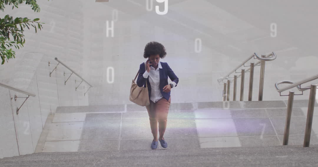 Image depicts an African American businesswoman engaged in a phone conversation while confidently climbing outdoor stairs in an urban environment, overlaid with animated digital numbers, symbolizing modern technology and dynamic work life. Suitable for illustrating themes such as business success, modern communication, work-life balance, technological integration, or urban professional environment. Ideal for use in business presentations, tech-related articles, marketing materials demonstrating mobile communication’s impact, or any creative work highlighting the fusion of technology and business.