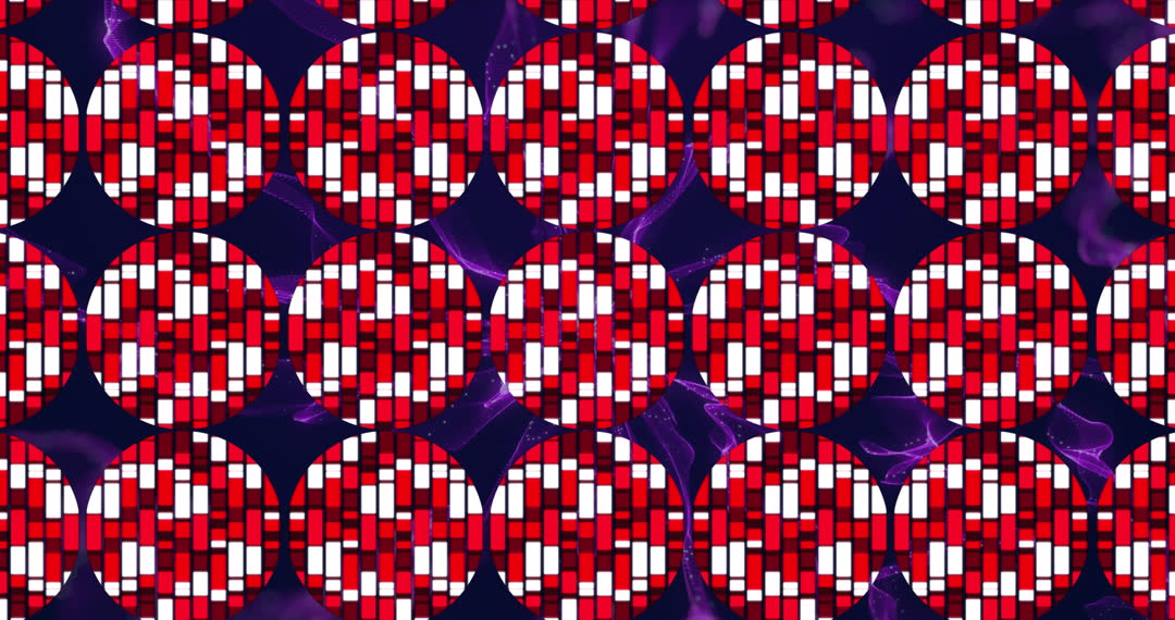 An engaging digital design featuring circles adorned with red and white squares against a navy background. Ideal for technology-related content or graphic design projects, this concept highlights movement and vibrancy, making it suitable for animations or modern visual publications.
