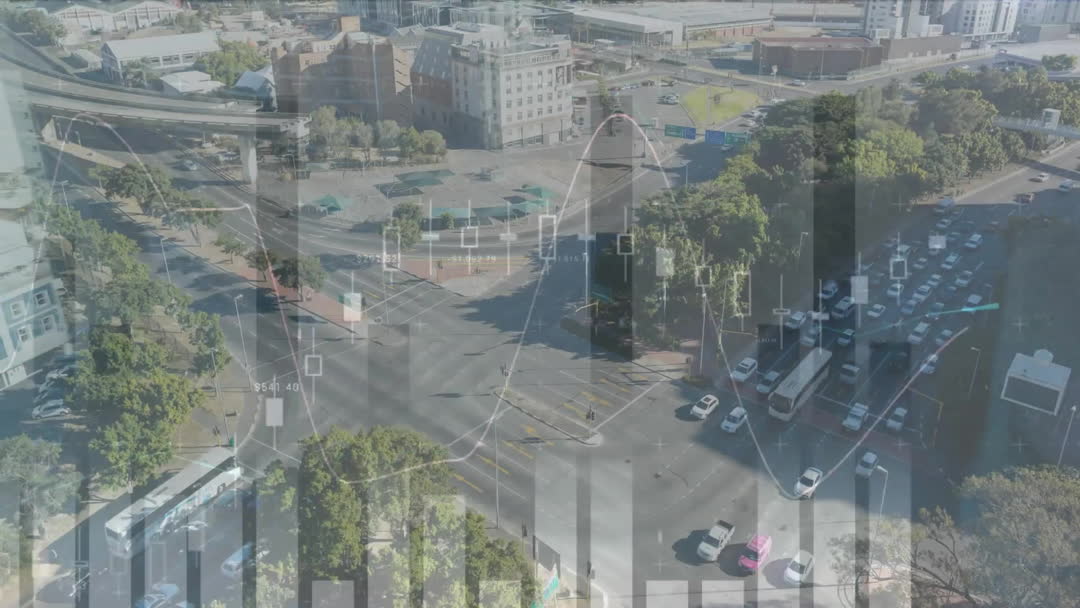 Dynamic Cityscape with Overlaid Financial Analytics Visual Video