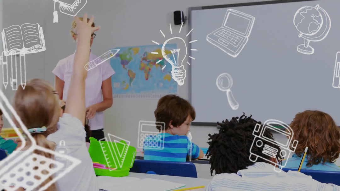 This depiction of a classroom shows students actively engaging with their teacher. Overlaid with educational icons like pencils, a light bulb, and a globe, it portrays a vibrant learning environment. Ideal for illustrating topics on global education, child development, or teaching methodologies.