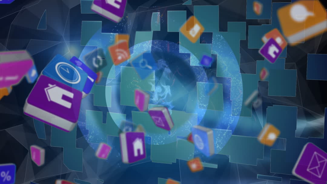 Abstract animation showing vibrant app icons, representing social media and technology. Use for content related to digital trends, cloud computing, or technological innovation. Highlights connectivity and modern communication.