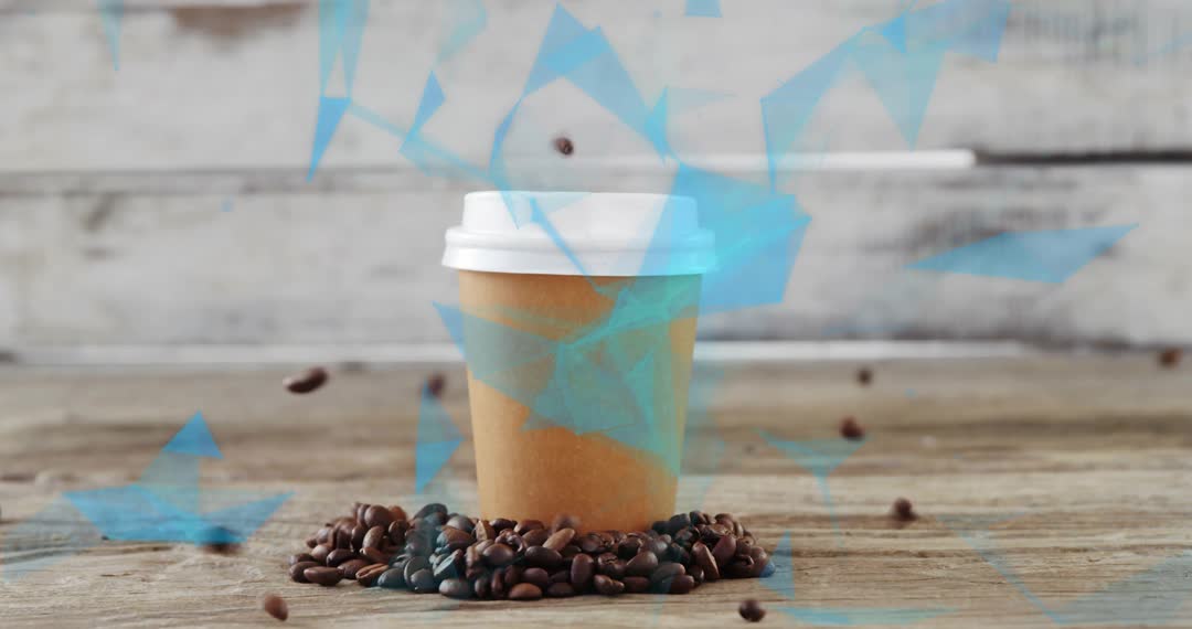 Video features a coffee cup surrounded by roasted beans as blue polygons swirl dynamically. Perfect for use in promoting barista culture, AI in coffee merchandising, and creating visually appealing digital content for coffee-related brands. Great for engaging coffee enthusiasts and enhancing digital marketing strategies.
