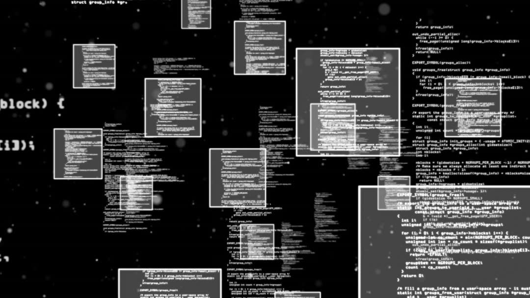 This video features an animated display of data and computer code floating against a dark background, depicting a futuristic tech environment. Suitable for illustrating concepts related to digital technology, computer programming, or data analysis in publications, presentations, and digital interfaces.