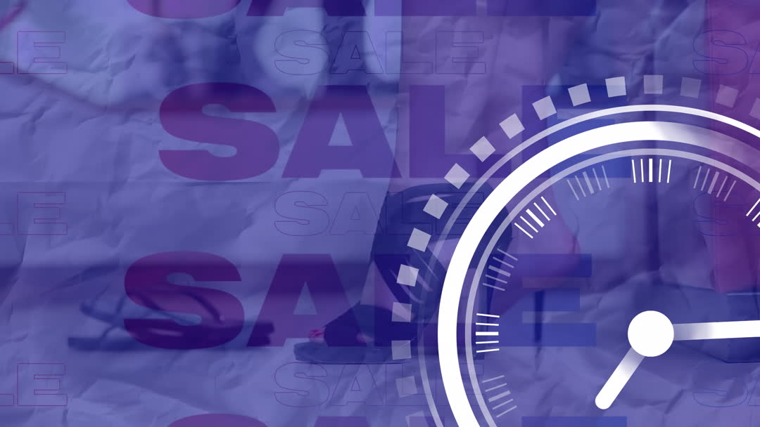Purple-themed design with an animated clock symbolizing urgency in sales. Incorporates moving sale text, ideal for banners and advertisements in retail or ecommerce sectors. Useful for creating a sense of excitement and promotion during sales events or campaigns.