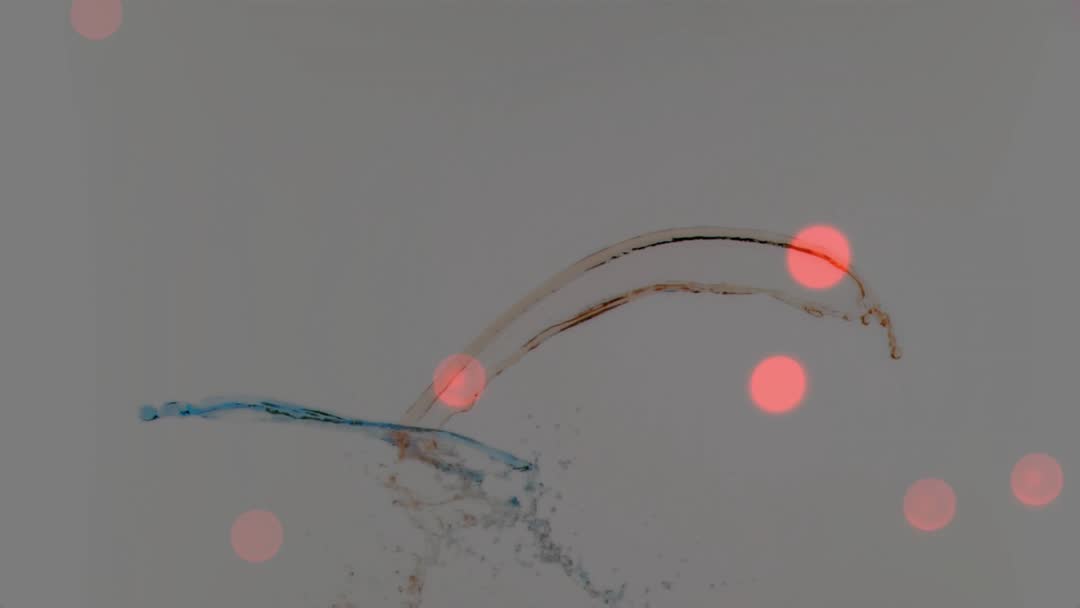 This visually stunning scene showcases dancing sprinkles of blue and amber liquid arcs creating beautiful shapes in mid-air. The red bokeh lights in the foreground add depth, enhancing the visual interest. Ideal for projects on modern art and design, educational content on fluid dynamics, or artistic digital creations.