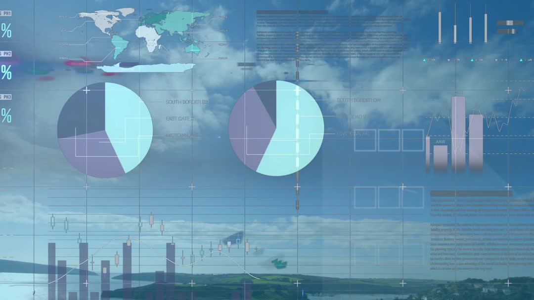 Modern video featuring dashboard with animated charts and graphs transitioning elegantly across a tranquil coastal backdrop. Ideal for illustrating financial data analysis, technological advancements, as well as illustrating composite techniques blending nature and technology. Valuable for content concerning innovation, data sciences, and international business outlook with natural calm themes.