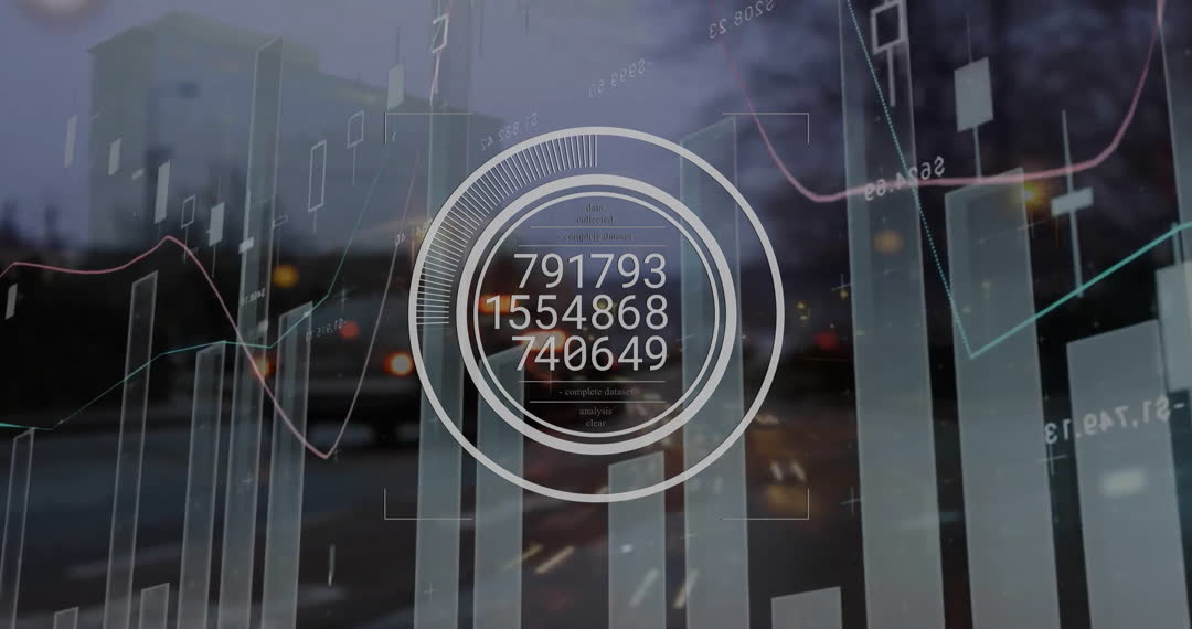 Overlay of dynamic numerical data and analytical graphics superimposed on a blurred city background, conveying concepts of digital transformation, data processing, and global communications. Useful for illustrating topics in digital marketing, data science, technology, and innovation business environments.
