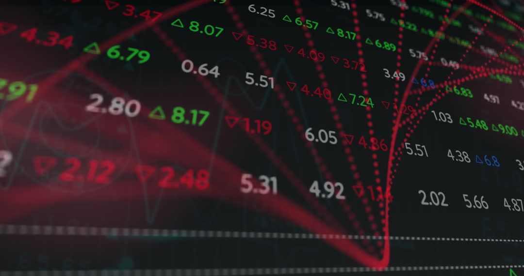 Dynamic visual of data processing with digital DNA strands formed by red glowing particles on a black grid background suggests technology innovation, finance insights, and global connections. Suitable for presentations or publications on data science, genetics, finance markets, or digital networks.