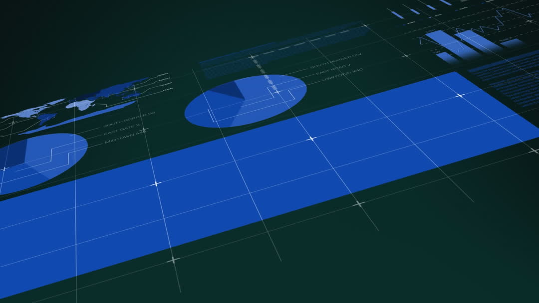 The video displays an animated depiction of data processing with charts and graphs set against a dark background. Suitable for illustrating concepts related to technology, global business analytics, and digital transformation. Ideal for presentations, marketing materials, and educational resources in data analysis or tech-focused areas.