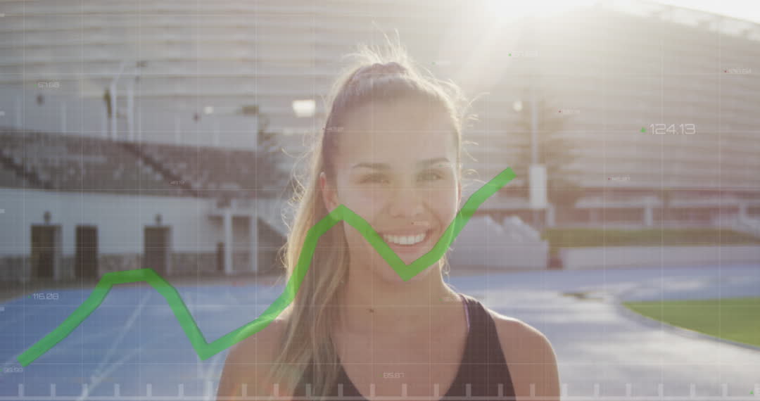 Caucasian woman in athletic wear with graph projection reflecting technology integration in fitness. Sunlight illuminates the outdoor track giving forward-looking aspect. Suitable for modern fitness, data-driven sports analytics, and health technology concepts. Ideal for illustrating synergy of sports and digital information.
