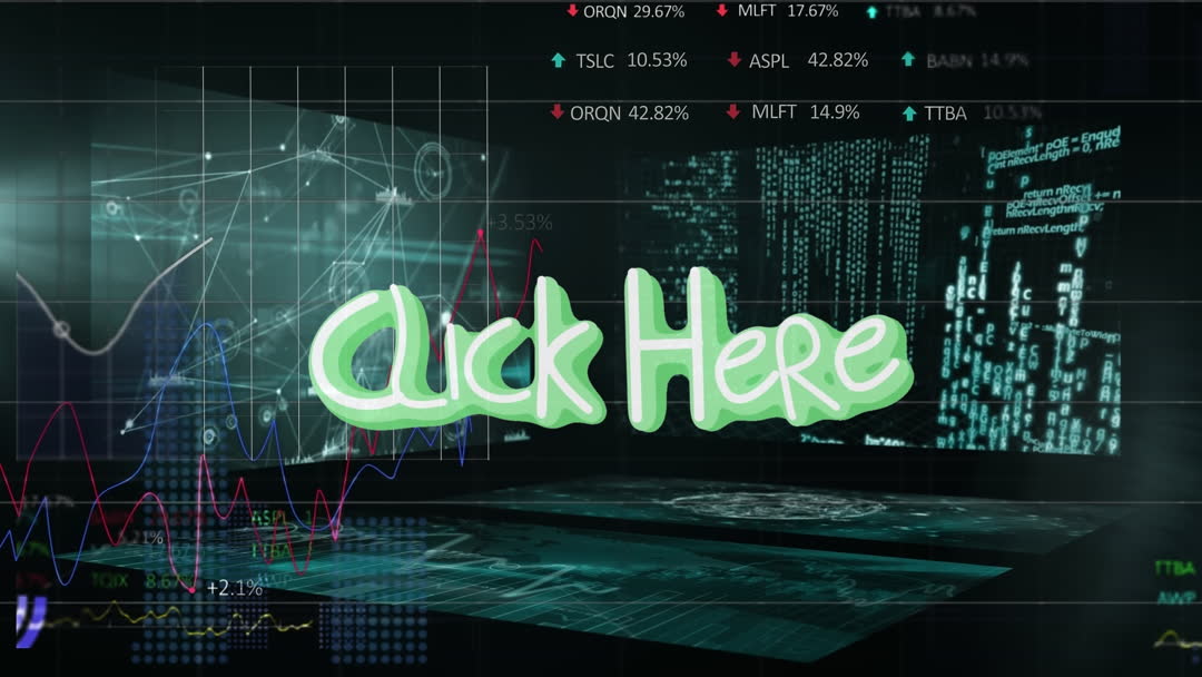Futuristic animation showcasing data processing and social media interface. The 'Click Here' text in bright hue draws attention amidst dynamic code and digital metrices backdrop. Useful in presentations about technology advancements, cyber interfaces, and social media engagement tactics. Ideal for illustrating tech-focused articles or creating interactive call to action videory for web design.