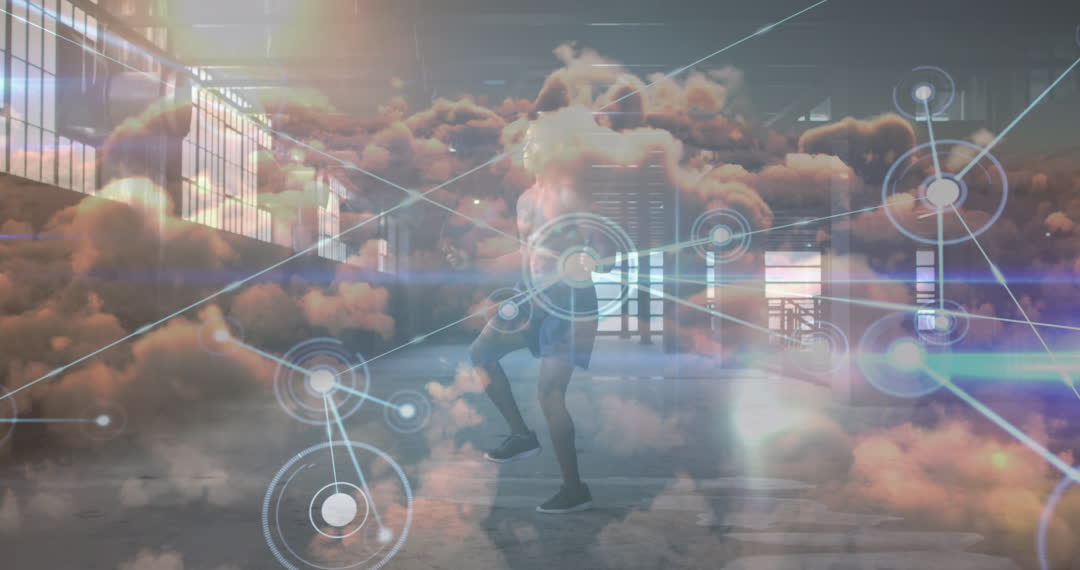 Visible overlays of digital data linked to a cloud in an industrial environment while an athlete is jumping rope, presenting a futuristic blend of technology and sports. This video might be used in projects regarding technology in sports, fitness apps, global communications, or digital trends.