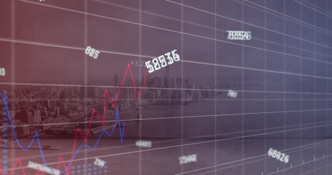 Shows animated statistical data with a city skyline in the background. Ideal for illustrating business trends, data analytics, technology advancements, or stock market activities. Suitable for presentations, marketing materials, or digital content on economic development and urban forecasting.