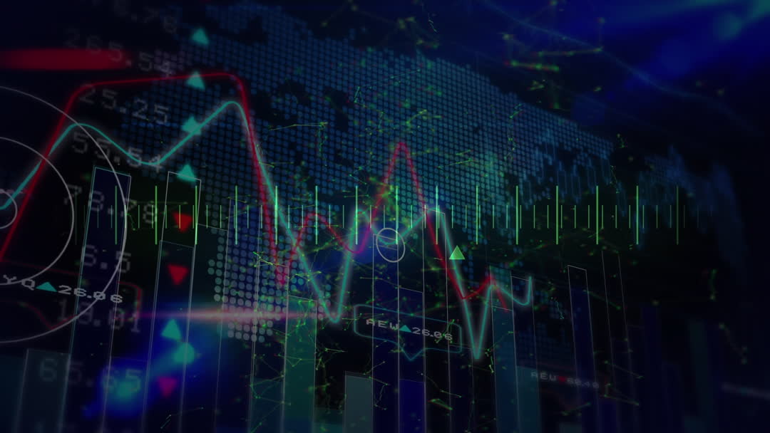 This stock footage portrays dynamic data visualization overlaid on a global map with financial charts and analytics elements. It is ideal for videos concerning global business strategies, data analysis, financial forecasting, and technology trends. Use it as a visual backdrop in presentations on international markets or in products narrating how digital data is shaping global economies.